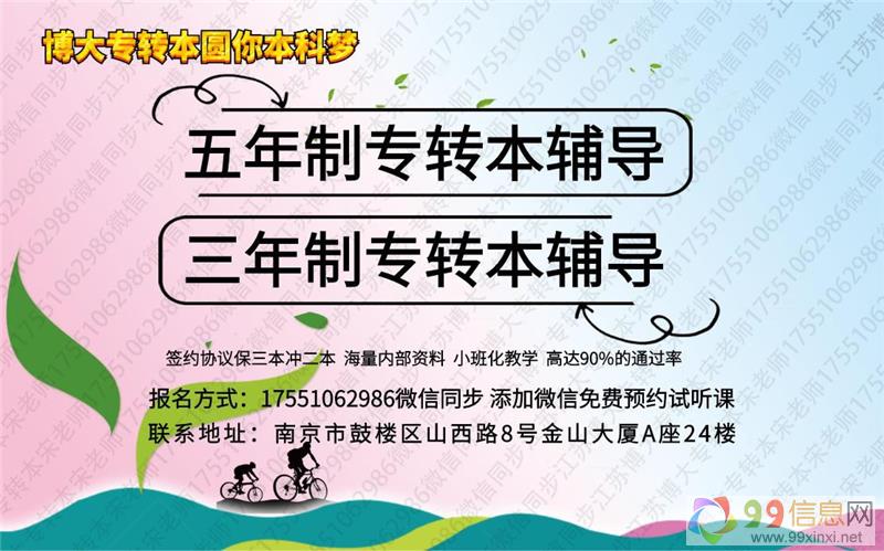 江苏瀚宣博大专转本学校与南京晓庄学院、金陵科技学院、三江学院等主考院校合作,编著权威内部资料,专业课复习试卷集,习题册,提前获取专业课精准考纲,并由主考院校名师授课,小班化教学,方便老师照顾到每位学员,执行严格的考勤制度,了解学员的上课情况,江苏瀚宣博大专转本学校在南京、常州、苏州、南通、无锡等省内各大城市均设有分校,同学们可联系招生老师 一⑦五五,一〇六二,⑨八六 微信咨询,添加微信可提前预约免费试听,地址南京市鼓楼区山西路8号金山大厦A座24楼原文www.99xinxi.net。