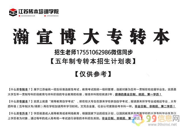 自2005年开设五年制专转本面授考前培训,瀚宣博大专转本是江苏省唯1一家规模化专转本连锁辅导机构!办学早,历史长,坚持诚信办学,一切为了考生的通过率,坚持聘请优秀老师授课,均为近十年辅导经验老师9_9_信_息_网。不仅提供学员更丰富的学习资源,高效的复习方法,英语辅导、专业课教学,还有专业的咨询、院校介绍、考纲提供、统一报名、志愿填报、集体送考等一系列流程化服务9 9 信 息 网。师资团队稳定,授课针对性强,预测准,学员上线率高,10多年来培训数万考生,大批学员从这里顺利通过五年制专转本考试,赢得良好的口碑,是学员的福音,更多转本详情联系 1755·1062·986 微信同步,添加微信免费预约试听课,可安排南京校区、无锡校区、南通校区、镇江校区、徐州校区等原文www.99xinxi.net。