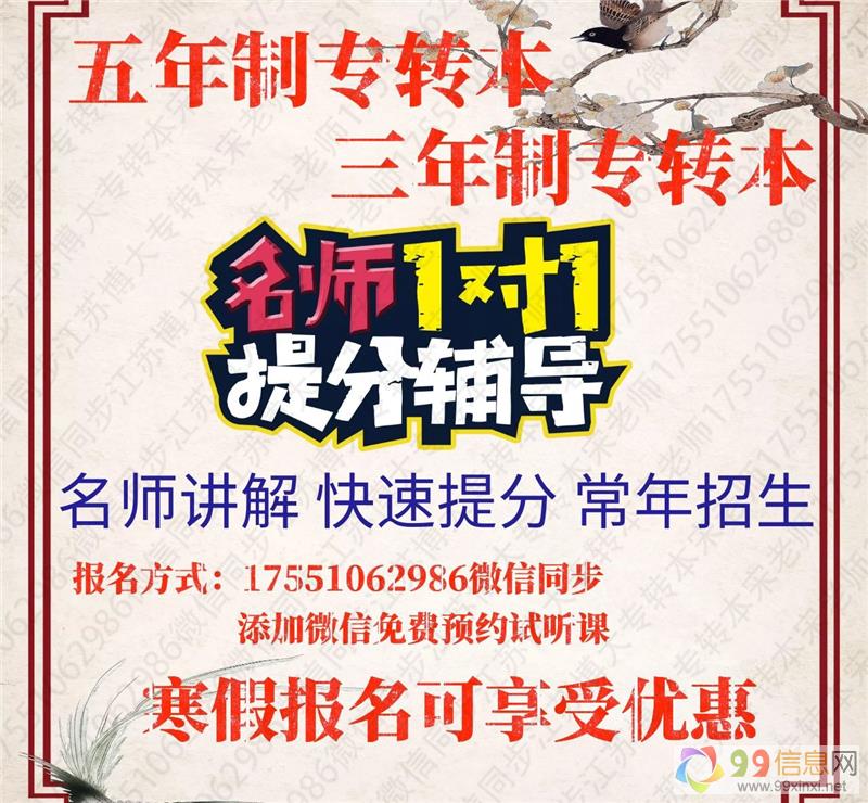 江苏博大专转本办学多年,教学经验丰富,与省内各大高校合作密切,对南京晓庄学院、金陵科技学院、三江学院等院校招生情况和考试重点把握准确,为同学们复习提供正确方向,具体班次有专转本辅导周末班、考前班、签约协议班、冲刺班、寒暑假集训班等不同班次,同学和家长可以联系招生老师 一七五五,一〇六二,九八六 微信同步咨询,添加微信可以预约免费试听课,地址南京市鼓楼区山西路8号金山大厦A座24楼来源www.99xinxi.net。