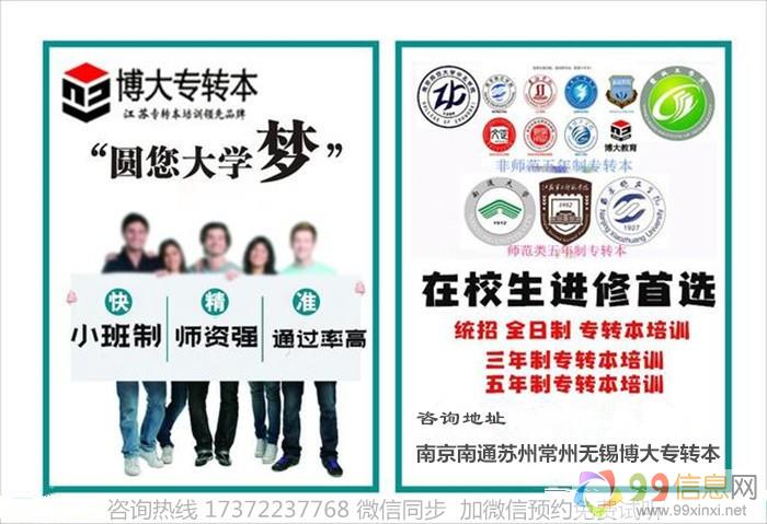 江苏瀚宣博大五年制专转本专业做五年一贯制专转本培训辅导13年,名师小班化教学,全日制上课模式,拥有一流的师资及精准的内部学习资料,全年滚动开班,随到随学,一次报名,可享受免费循环上课直至考试的服务,中间不收取任何费用。瀚宣博大五年制专转本学校根据学员基础提供专业咨询、院校介绍、英语辅导、考纲提供、专业课教学、统一报名、集体送考等一系列流程化服务,让考生对五年制专转本的了解更加深入,更加有方向性和针对性,并开设英语和专业课辅导,英语从基础的音标开始教起,培训词汇、语法、阅读、完形、写作,并通过测试及时掌握学员学习情况;专业课根据主考院校考纲上课,让考生复习更有针对性和方向性,省内更有南京、南通、无锡、苏州、常州等多家分校,更多详情及预约免费试听请联系总校刘老师一七三七二二三七七六八,微信同步,总校地址:南京市鼓楼区山西路8号金山大厦A座24楼。99信息网
