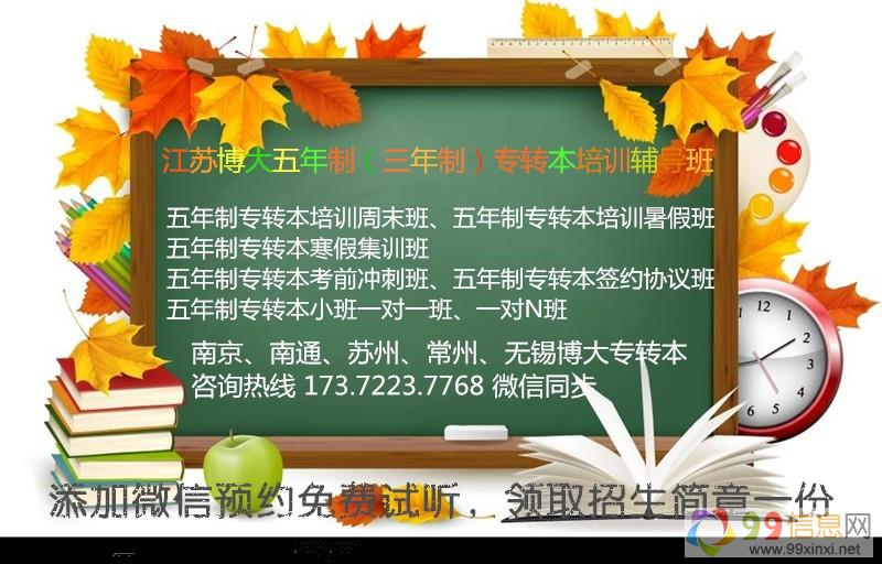 江苏瀚宣博大专转本江苏唯一一家拥有10年五年制专转本(五年一贯制专转本)办学辅导经验的培训机构,小班化教学,全日制上课模式,高考式复习管理,辅导英语(语法、词汇、阅读、完型、写作等)和主考院校专业课,专业课包括财务管理、国际经济与贸易、工程管理、秘书学、旅游管理、自动化、护理、小学(幼儿)教育等专业,配合南京晓庄、金陵科技、三江学院、苏大文正、苏大应用、淮阴工学院、盐城工学院等主考院校精准考纲,根据考试的重点和难点进行针对性的辅导和查漏补缺,提升学员基础和应试能力,并根据学员基础设置了英语单科班、寒暑假集训班、考前辅导班、强化班、签约协议班,保三本冲二本,协议有保障,考生可先在就近校区做个测试,看看自己的基础怎么样,其次根据老师讲得好不好,适不适合自己,再选择报考班次,预约免费试听联系总校刘老师一七③,七二③三,七七⑥八,微信同步,可预约试听校区:南京金山校区、镇江中山校区、南通南大街校区、苏州石路校区、常州国贸校区、无锡汇金校区9_9_x_i_n_x_i_n_e_t。