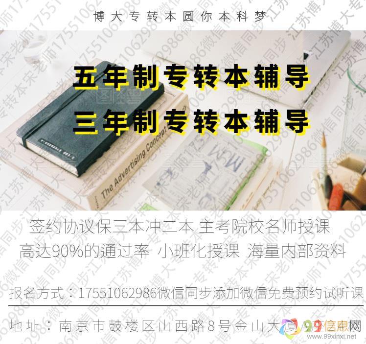 江苏瀚宣博大五年制专转本学校专业从事五年制专转本辅导13年,帮助众多学员成功转本,本着保三本冲二本的服务理念,江苏瀚宣博大专转本与南京晓庄学院、金陵科技学院、三江学院等主考院校合作,辅导各主考院校专业课,包括财务管理、旅游管理、会计、计算机、护理、药学等专业,编著权威内部教材资料,提前获取专业课精准考纲,并提供专业课复习试卷集,习题册等,帮助同学们高效备考,具体招生详情联系招生老师 一⑦五五,一〇六二,⑨八六 微信同步,添加微信免费预约试听课,地址南京市鼓楼区山西路8号金山大厦A座24楼。