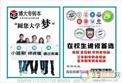 江苏瀚宣博大专转本培训学校各城市各大校区暑假班开班时间定于7月10日,结束时间八月中下旬左右,暑期集训班为期三十到四十天左右,暑假的重要性不言而喻。江苏瀚宣博大五年制专转本学校(五年一贯制专转本) ,十几年倾注于本科教育,年培训人数高达万人,江苏博大教育培训学院开办周末班,寒暑假集训营、考前辅导班、协议班等不同的班次,采用半封闭式管理,全天候复习,理论与实际相结合的教学模式进行为期的集中学习。历年江苏学历教育培训学院集训营通过率三本80%,二本70%以上,瀚宣博大教育拥有先进的教学技术和一流的教师团体,一流品牌值得您信赖9+9+信+息+网。南京博大五年一贯制专转本教育培训学校是一家专做五年制专转本培训的培训辅导机构,有10年的专转本经验。历年来帮助数千名学生成功转本。目前在南京、无锡、苏州、常州、南通、镇江等设有培训点,具体咨询江苏瀚宣博大吴老师:一八零零五一四三六四五(微信同步),找江苏瀚宣博大吴老师可以免费领取五年制专转本试听卡免费 预约试听课程。