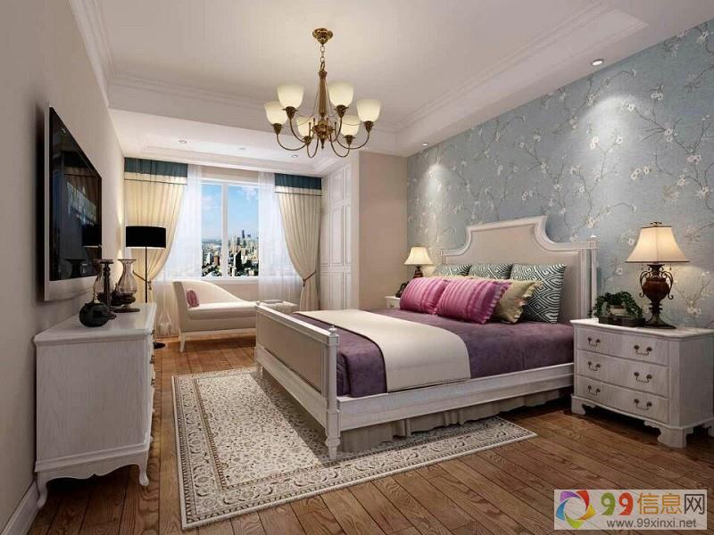 以白色装饰柜和墙纸为背景,地面采用美式典型的拼花地砖,卧室通过床、电视柜、墙纸、窗帘等凸显美式宁静恬淡的