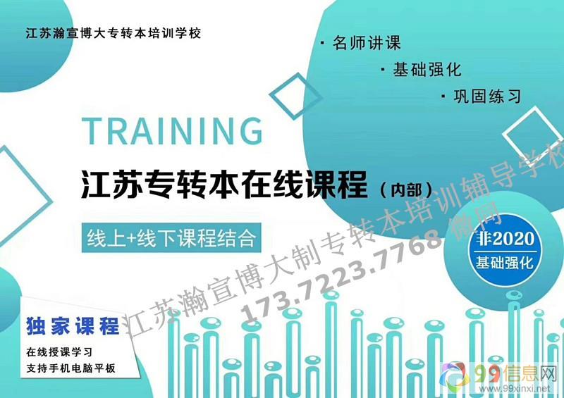 江苏瀚宣博大专转本是江苏省唯1一家专业做五年制专转本(五年一贯制专转本)的培训辅导机构,发展于2005年,积累了一套更加适用于专转本备考生的学习计划,根据考生的不同学习情况分班上课,让考生紧跟授课老师的复习节奏,也更便于老师管理每一位学员的最新学习情况及进行针对性辅导和查漏补缺!江苏瀚宣博大专转本是高端连锁规模化的辅导机构,选用五年制专转本领域多年教学经验的一线名师,甚至有着与命题人同样的教学背景,并采用独家内部编写教材,最有效的集中面授高三式教学模式,每个专业招限招20人,超小班化教学,严格把控考生的录取率;同时专转本是改变五年制高职考生人生命运的机会,转本成功才是硬道理9.9.信.息.网。江苏省五年制高职许多教材教辅都是院校内部出版的,相信五年制高职的学对五年制院校有所了解,我们在课程开发和师资力量上有着绝.对的优势;另外绝大多数五年制专转本培训班,在五年制专转本培训经验上其实是相对缺乏的,无论在命题趋势把握方面,还是专业知识上面,江苏瀚宣博大专转本的教学团队都有着明显的优势9.9.x.i.n.x.i.n.e.t。并且办学较早的五年制专转本机构也是比较有信服力的,毕竟市面上的小机构就是这两年才开始招生,对于专转本的经验远不如大机构、大品牌有保障!并且凡是参加我中心五年制专转本培训的考生,我们都会免费给大家做志愿填报指导,确保我们的考生赢在填报志愿上,更多五年制专转本详情级预约免费试听可联系总校刘老师一七③七二②三七⑦六八,微信同步,咨询校区:南京总校、徐州校区、镇江校区、南通校区、苏州校区、常州校区、无锡等校区99xinxi.net。由于疫情暂不能线下授课,有意向的考生可先上我们的线上课程HFq。