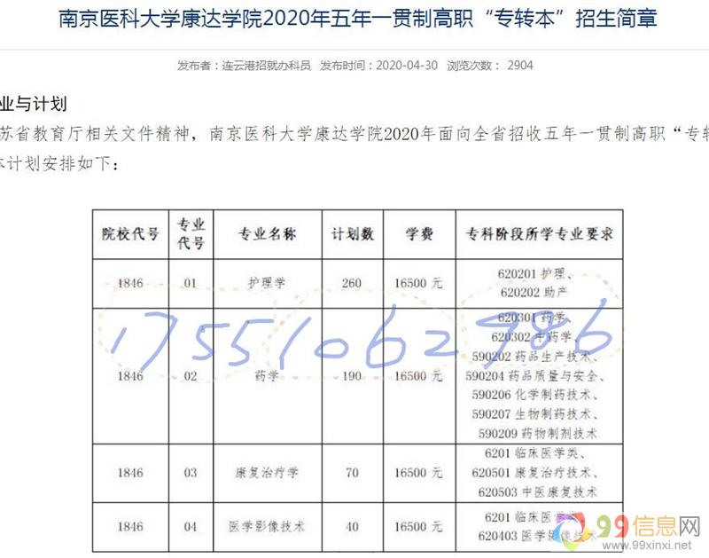 五年制专转本考生只有一所医学类院校报考,即南京医科大学康达学院,院校报考要求及考试科目如下: