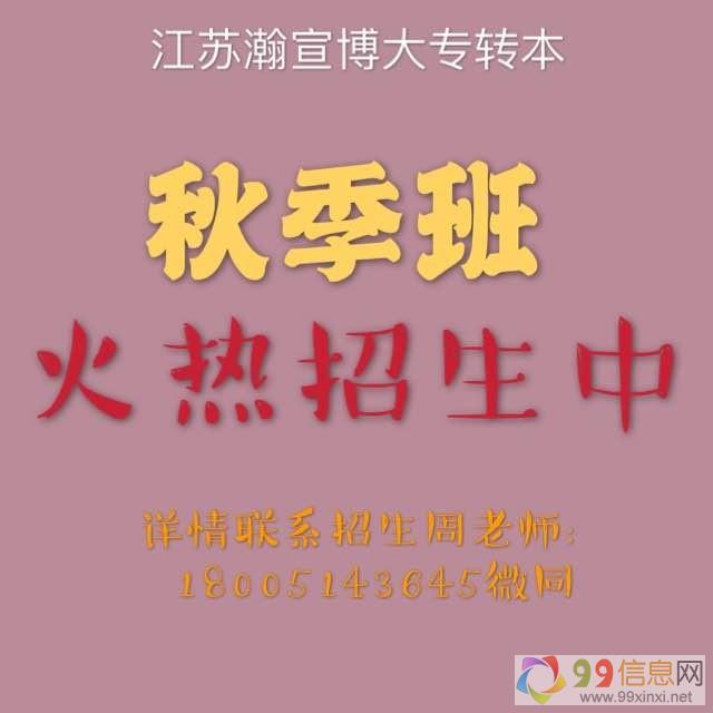 江苏瀚宣博大专转本培训学校与南京晓庄学院、金陵科技学院、江苏第二师范学院、南京师范大学中北学院等主考院校密切合作,提前获取专业课精准考纲,根据考纲针对性辅导和查漏补缺,还有各个专业的复习资料,有效的帮助学生发现问题,解答问题。英语更有历年真题卷、模拟卷、押题卷,提升学员应试技巧和解题速度,零基础的考生也不用担心,江苏瀚宣博大专转本从基本的音标开始教起,逐步提升您的基础能力具体培训详情联系招生周老师:一八零零(薇)伍壹肆(信)三六四五,添加微信免费预约试听课,秋季班火热招生中,名额有限,先到先得9 9 信 息 网。