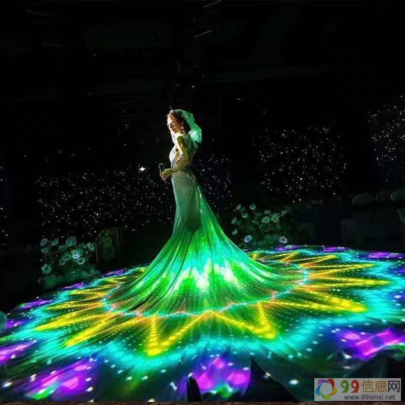 星河裙摆是在高端商演(婚礼)上,由歌手(新娘)神穿洁白巨型拖地长裙,在巨大的舞台,运用全息投影技术,结合现场光、影与音乐的完美映衬下,变幻出闪耀着五彩缤纷、绚烂夺目的特效裙子,者散发出一种诱人魅力,宛如灰姑娘的魔法之神,与宇宙、星辰、云彩之中,让演唱舞台演出效果堪称惊艳全场。9+9+信+息+网