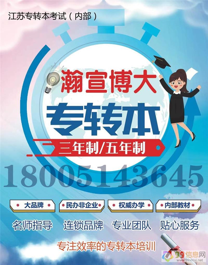 江苏南京瀚宣博大五年制专转本自2005年创办以来,以一流的师资为核心力量,用更加现代化及创新的教育理念引导学生轻松学、开心学,让学生在良好的学习环境中提高学习成绩;并以多所本科院校为坚强后盾,打造江苏五年制专转本第1品牌,提前获取各大主考院校精准考纲,根据考试的重点和难点进行针对性辅导,并为各学科配备一定的练习题,供考生们进行巩固练习,夯实基础,考前更有薄弱项辅导模式,查漏补缺,让考生学得更扎实。更多详情可免费咨询武老师:180(微)0514(同)3645,fky186微9_9_x_i_n_x_i_n_e_t。