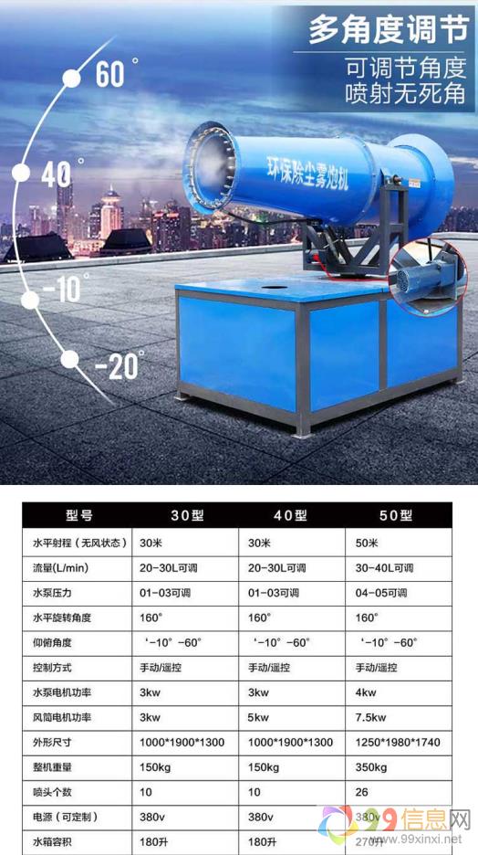 雾炮机射程远,水雾覆盖面积大,能够实现定时精准喷雾9~9~x~i~n~x~i~n~e~t。它喷出的雾滴直径小,容易和粉尘结合,可以使建筑工地快速降尘9_9_x_i_n_x_i_n_e_t。它可以固定在混凝土平台上面,也可以安装在移动运输车辆上,从而实现定向除尘和移动除尘等多方位除尘效果原文www.99xinxi.net。它采用三相电或者柴油发电机组提供动力,操作简单,能够采用遥控和手动两种控制,可以随意调节喷雾的水平角度,让喷雾的覆盖面积更广,是大型建筑工地治理扬尘污染的利器9_9_信_息_网。
